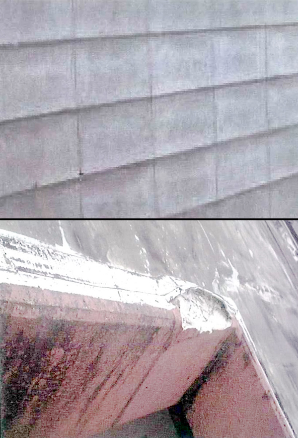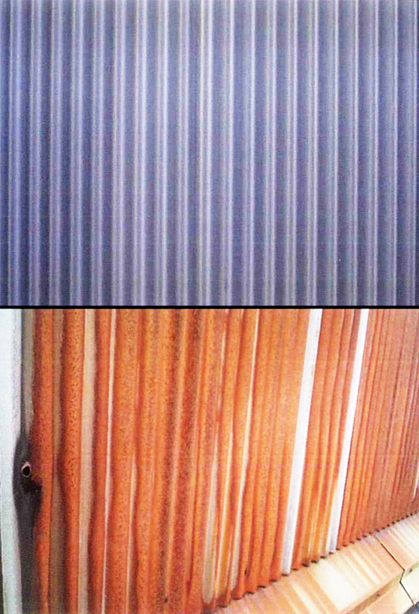 防水力が低下し農薬、潮風、雨風、日光、などによりトタン(鉄)が錆、赤錆、白錆、止め釘の錆び及び浮きが起こる。