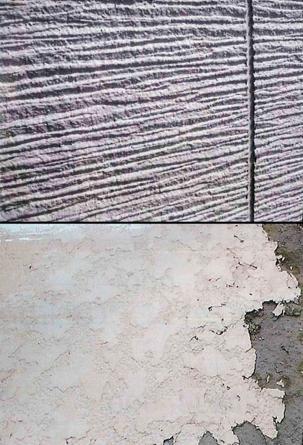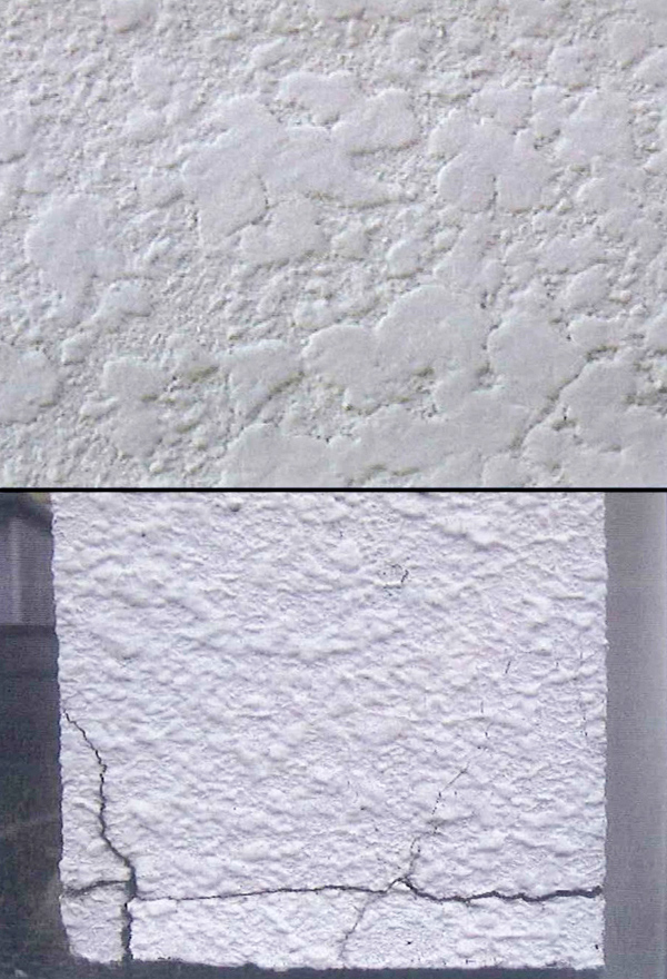 防水力が低下するとモルタルが吸水し冬場気温がマイナスになるとモルタル内の水が凍る事により、体積が増えモルタルが割れる。 またモルタルを壁に定着させる為に使用するラスメッシュ(網状の針金)が錆びる事で約1.5~2倍の太さになりモルタルが割れる。